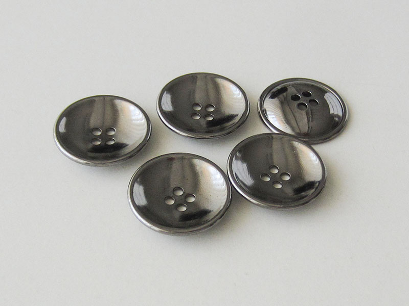 Diese interessanten Metallknöpfe sind leicht glänzend chromfarben (wie dunkles Silber) und haben die Form einer Schüssel, das heißt sie sind stark nach innen gewölbt und haben einen hochstehenden Rand. Ansonsten haben die Knöpfe vier Knopflöcher zum Annähen.
