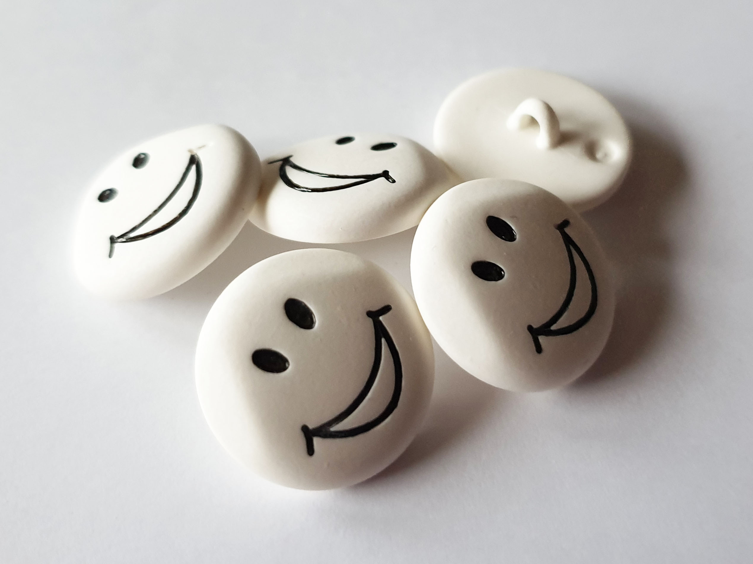 Beschreibung "Schwarz-weiße Kinderknöpfe aus Kunststoff mit lachendem Smiley / Emoji"