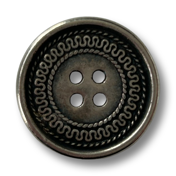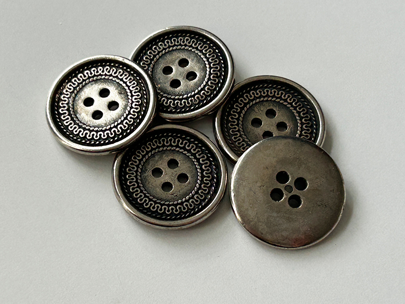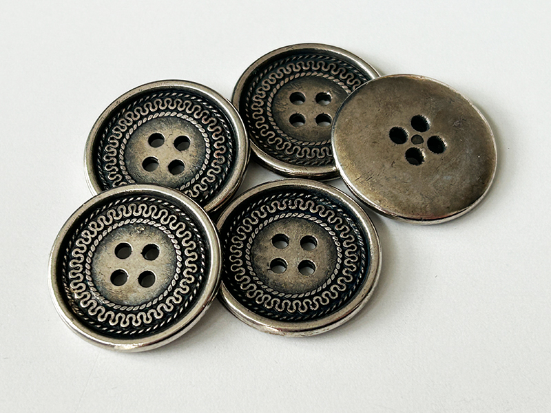 Beschreibung "Schwere Metallknöpfe altsilber – kompakte 4-Lochknöpfe im Vintage-Stil"