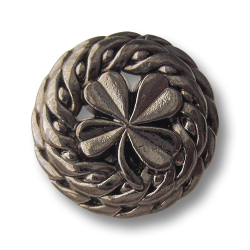 Das vierblättrige Kleeblatt kommt auf diesen glänzend chromfarbenen (dunkelsilber) Metallknöpfen sehr schön plastisch heraus, ebenso die doppelte kordelähnliche Umrandung, die zum Teil mit kleinen chromfarbenen Perlen verziert wird. Zwischen den einzelnen Kleeblättern ist der Knopf mit einem Durchbruch gearbeitet. Auf der Rückseite befindet sich eine Öse zum Annähen.