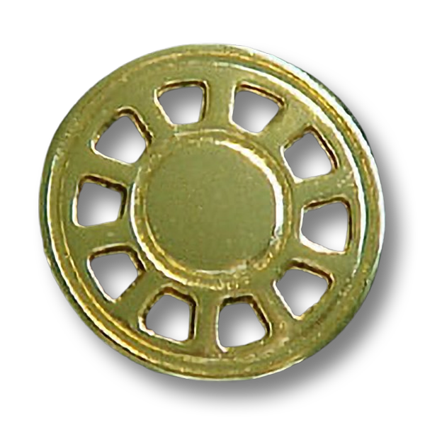 Dieser goldfarbene Metallknopf hat ein ganz besonders schlichtes, und doch raffiniertes Muster: Er hat durchbrochene Stellen, die dann den darunter liegenden Stoff durchschimmern lassen. Ich biete ihn in verschiedenen Größen an!