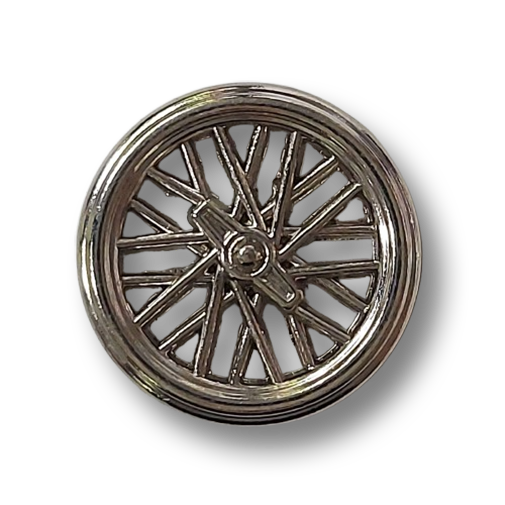 Diese, in meinen Augen besoders gelungenen und ausgefallenen Metallknöpfe sehen aus, als seien sie Speichen-Felgen. Durch die Speichen schimmert dann der darunter liegende Stoff.