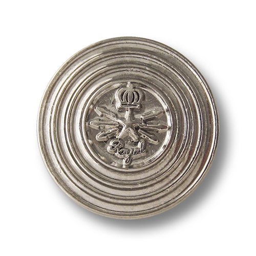 Diese silberfarbenen Metallknöpfe zeigen in der Mitte einen fünfzackigen Stern, von dem 6 Pfeile ausgehen. Darüber befindet sich eine Krone und darunter ist der Schriftzug "Royal" in eleganter Schreibschrift zu lesen. Eingerahmt wird das Motiv von vier erhabenen silberfarbenen Ringen, die sich terassenartig abwärts zum Rand erstrecken. Auf der Rückseite befindet sich eine Öse zum Annähen.