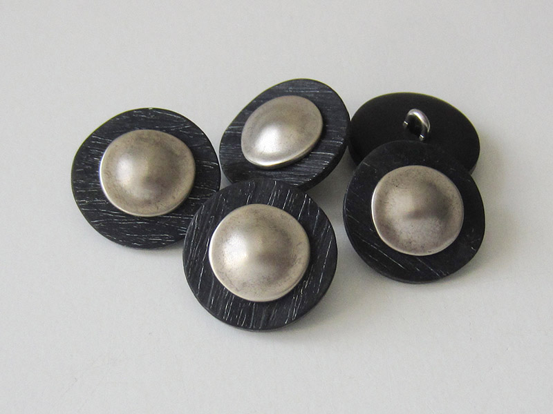 Diese urigen Trachtenknöpfe bestehen aus 2 Teilen: in der Mitte sieht man einen leicht gewölbten runden Teil aus altsilberfarbenem Metall, darunter befindet sich ein Kunststoffteil, das echtem Büffelhorn nachempfunden ist. Da es sich bei diesen Trachtenknöpfen nicht um echte Büffelhornknöpfe handelt, sind diese vorliegenden Knöpfe deutlich günstiger und pflegeleichter. Die Knöpfe zeigen kein Muster, was sie besonders zeitlos macht und somit auch gut an historischen Kostümen einsetzbar sind.