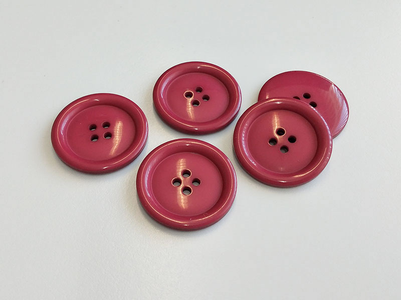 Beschreibung "Weinrote, zeitlose Mantelknöpfe aus Kunststoff mit vier Knopflöchern"