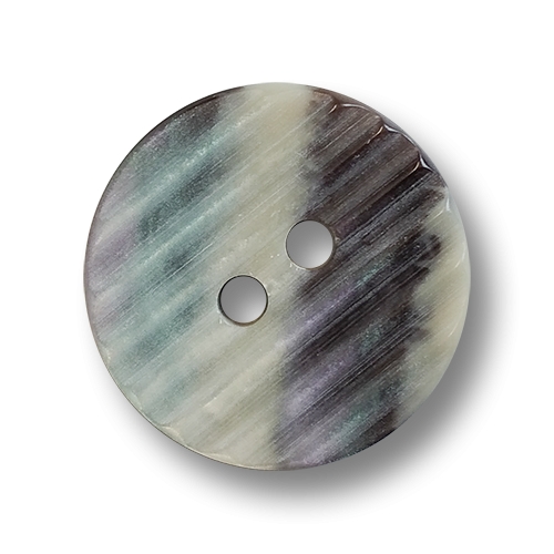 Diese Knöpfe sehen fast aus wie Perlmuttknöpfe, bestehen aber tatsächlich aus Kunststoff und sind deswegen besonders leicht und pflegeleicht. Die Kunststoffknöpfe haben eine geriffelte Oberfläche und zwei Löcher. Die Basis der Kunststoffknöpfe ist ungleichmäßig blau, beige, weiß und grau schillernd.