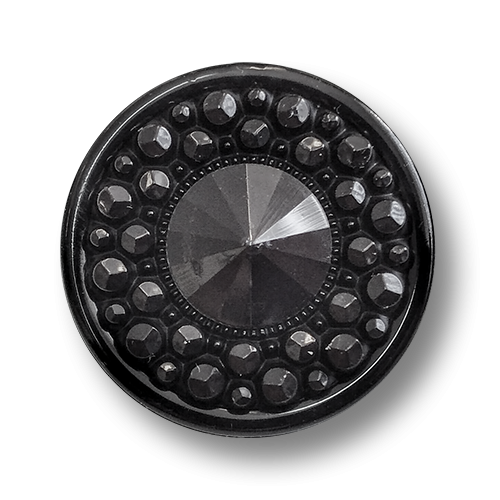 Diese hübschen Kunststoffknöpfe sind sehr leicht und komplett schwarz. Im Tageslicht zeigen die Knöpfe einen leichten Violett-Ton, was durch die Färbung bedingt ist. Die Vorderseite der Kunststoffknöpfe sieht aus wie mit facettierten Glitzersteinen besetzt. Die schwarze Kunststoffknöpfe glitzern je nach Lichteinfall und sehen fast aus wie echte Glasknöpfe, obwohl sie deutlich leichter und robuster sind. Auf der Rückseite der funkelnden Glitzerknöpfe befindet sich eine Öse an der sie befestigt werden.