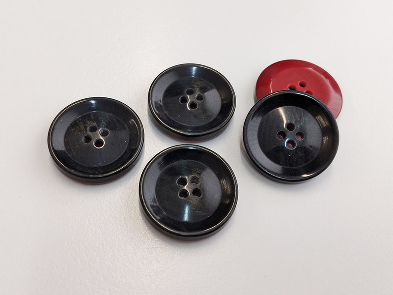 Beschreibung "Zeitlose, dunkelgrau bis schwarz schimmernde Knöpfe mit vier Löchern und roter Rückseite"
