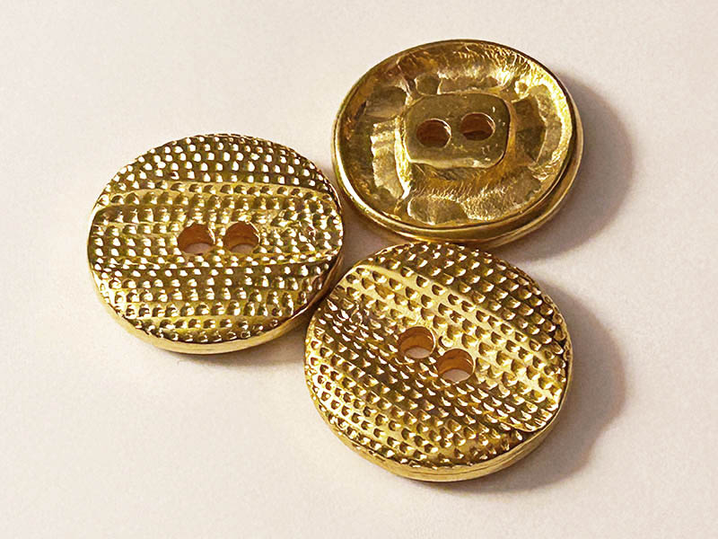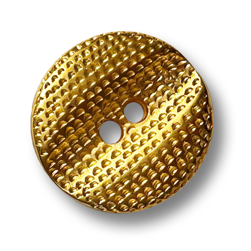 Diese runden Metallknöpfe in Goldoptik haben zwei Löcher für die Befestigung.